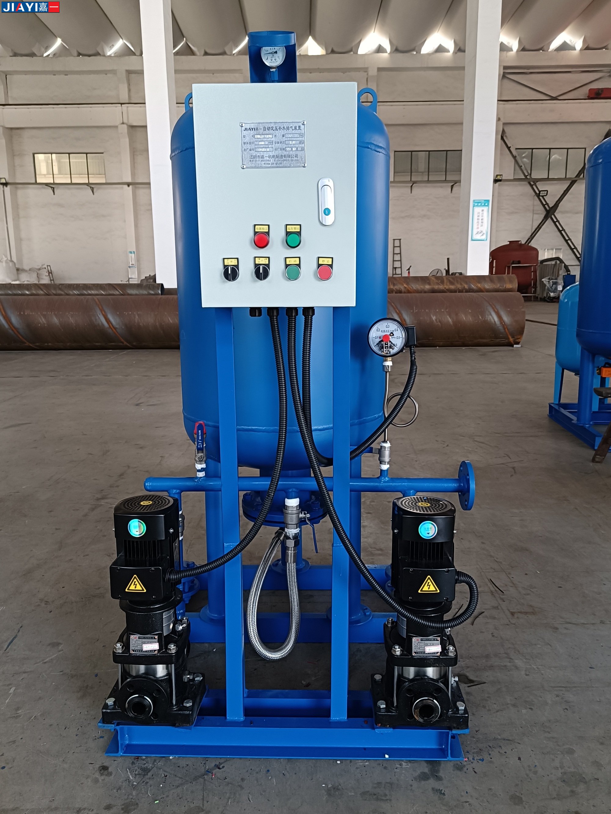 由囊式壓力罐、水泵、控制箱、底架、壓力感應裝置、管道閥門等組合而成,是一種兼有升壓、調節、儲水、供水等多種功能的常用供水設備。